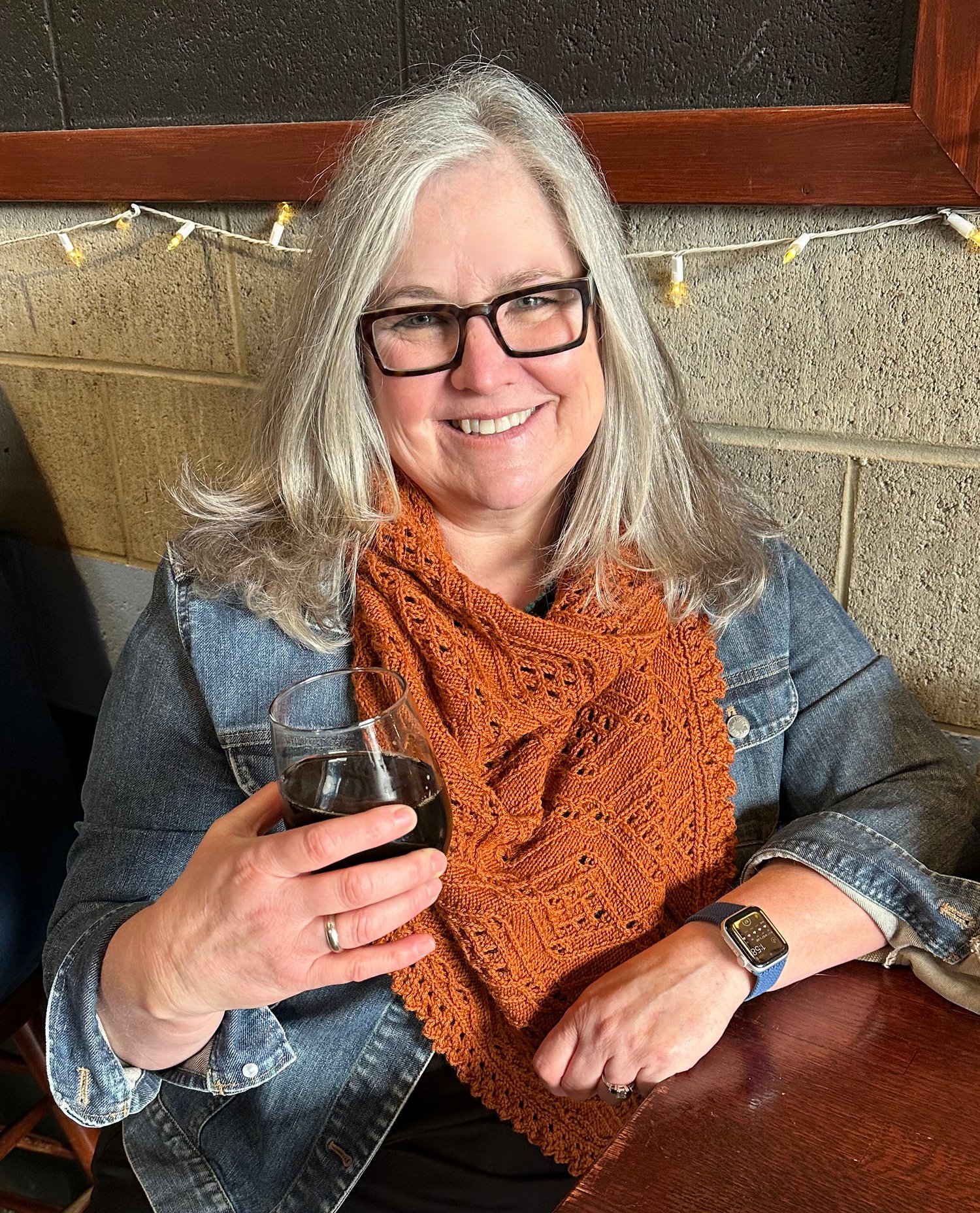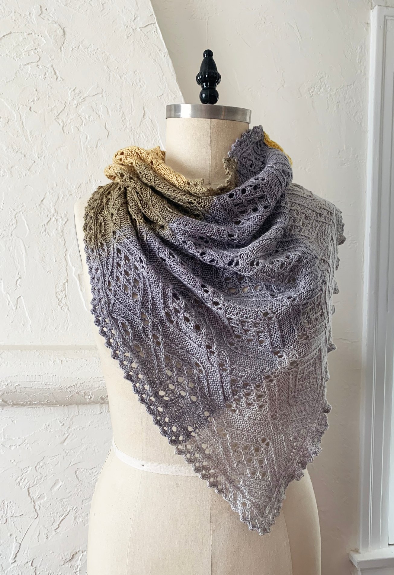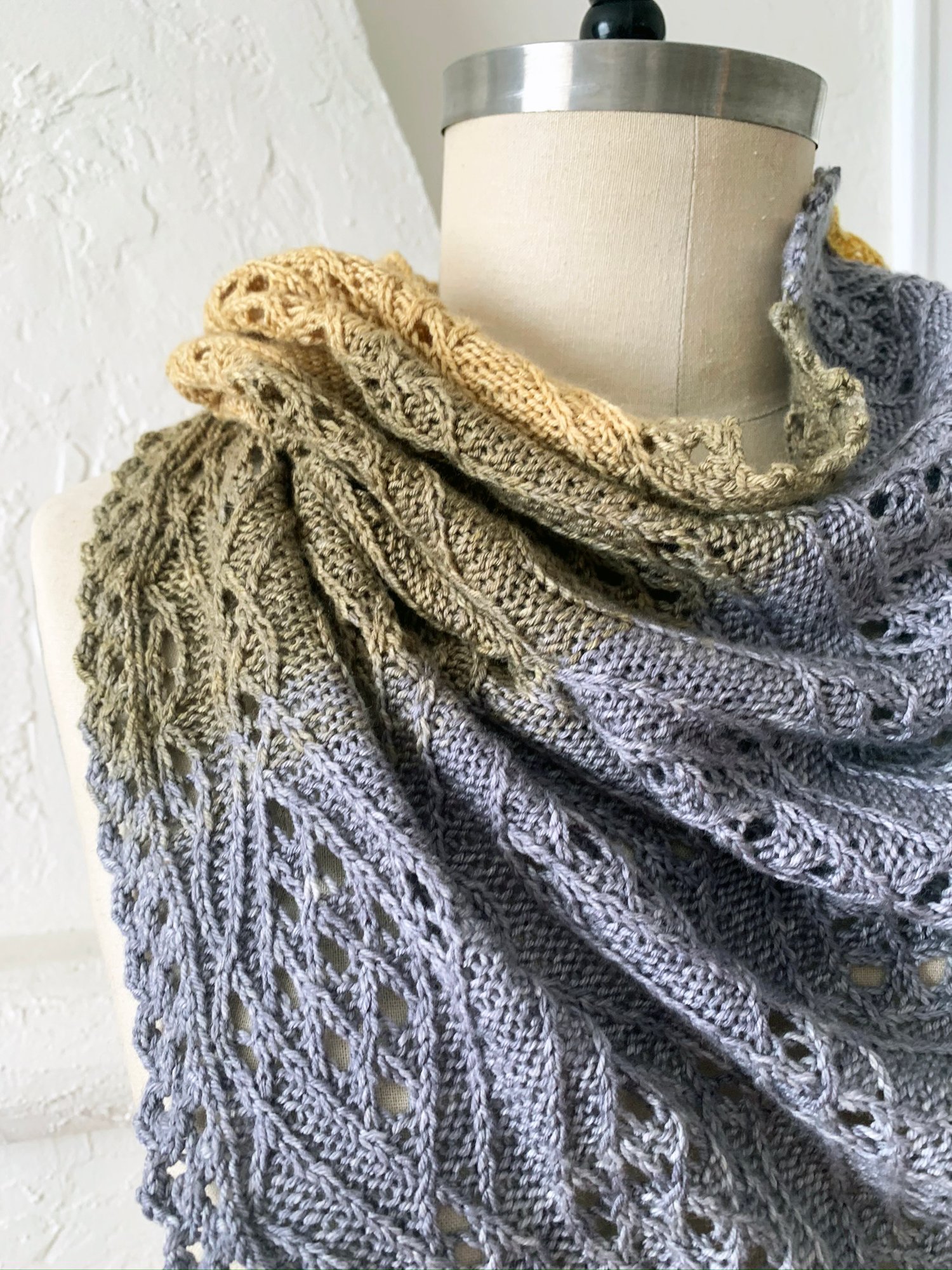 Knit it in your favorite fingering weight yarn. It works up beautifully in a gradient yarn, as shown, or in solid, subtle semi-solid, or heathered yarns.